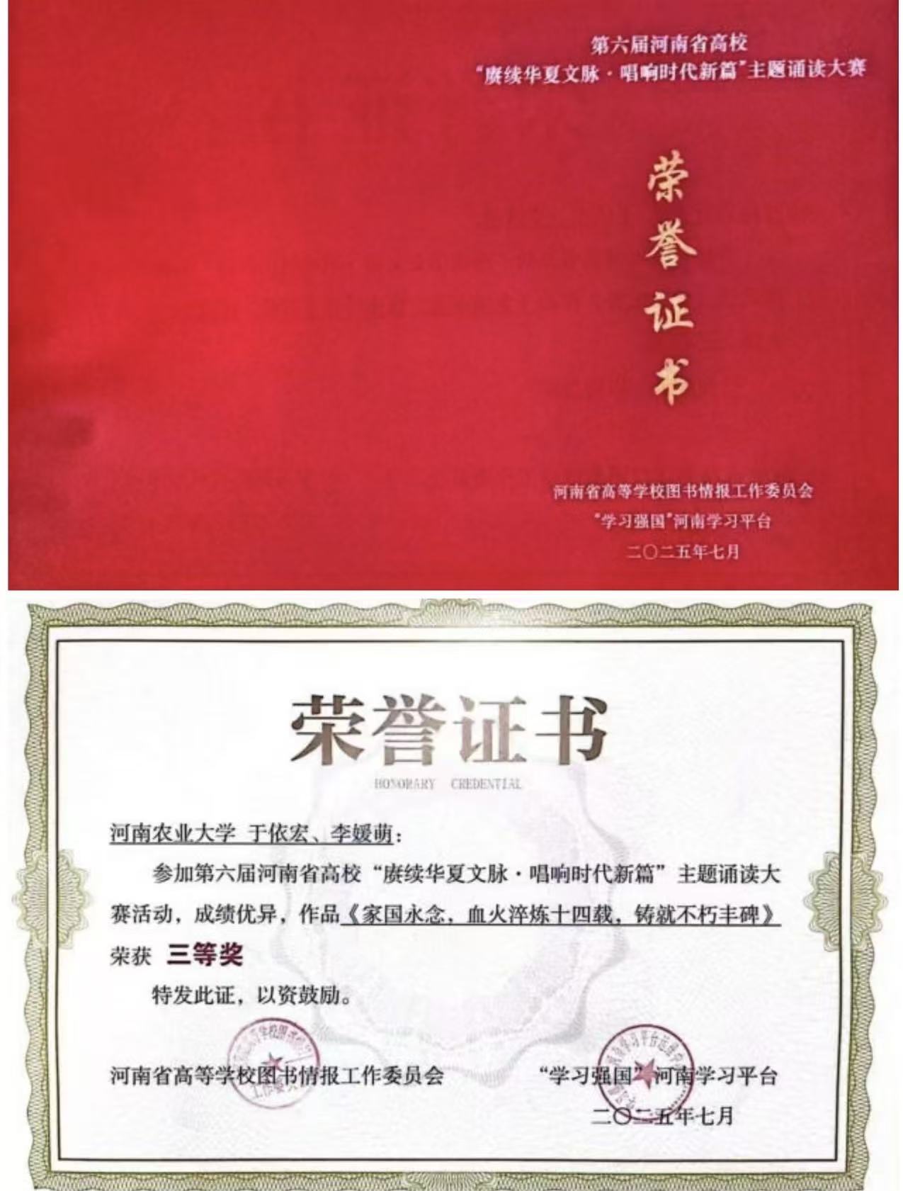 此次比赛由河南省高等学校图书情报工作委员会、“学习强国”河南学习平台联合主办。肉漫屋 24级翻译二班于依宏、李媛萌在教师徐思园的悉心指导下,凭借出色表现在本次大赛中斩获省级三等奖,实现了肉漫屋 在该赛事奖项上“零的突破”,充分展现了肉漫屋 学子扎实的专业素养与积极向上的精神风貌,也体现了指导教师“实践育人”理念的显著成果。