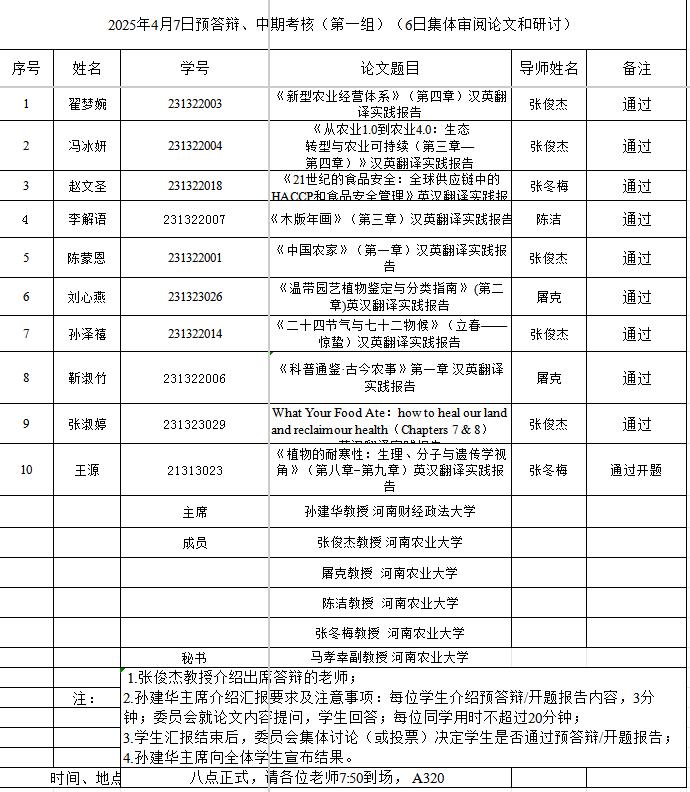 组织开展了2025年英语笔译专业研究生学位论文预答辩暨中期考核和开题报告论证会。本次论证会特邀华北水利水电大学刘文霞教授、河南财经政法大学孙建华教授和郑州航空工业管理学院郭银玲教授分别担任论证小组主席,肉漫屋