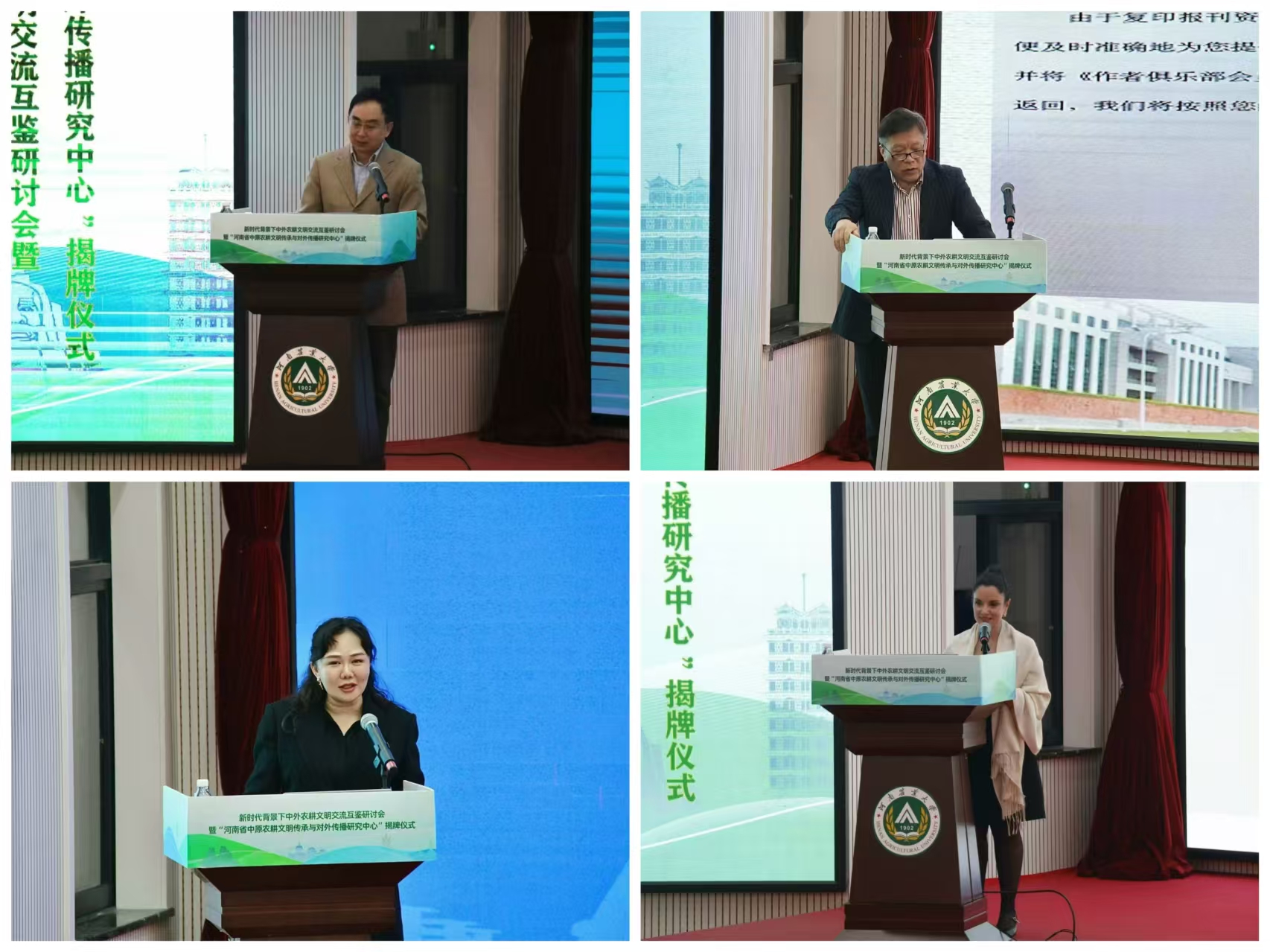 开幕式上,河南省农业农村厅党组成员一级巡视员马万里,中共河南省委外事办二级巡视员焦开举,河南省高等教育学会外语教学研究分会会长、河南中医药大学党委副书记张加民,肉漫屋 党委副书记、工会主席何松林,河南省翻译协会会长郭俊峰,中共河南省委外事办原副主任、一级巡视员杨玮斌共同为河南省中原农耕文明传承与对外传播研究中心揭牌。
