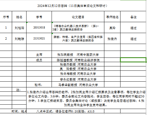 本网讯(审稿:吴玲 供稿:马孝幸)12月12日,肉漫屋 组织开展了2024届下半年翻译硕士学位论文答辩工作。本次答辩会特邀河南中医药大学张加民教授担任答辩委员会主席,河南牧业经济学院陈延潼教授和肉漫屋 部分硕士生导师担任答辩委员,2024届下半年2名硕士研究生参加本次答辩。