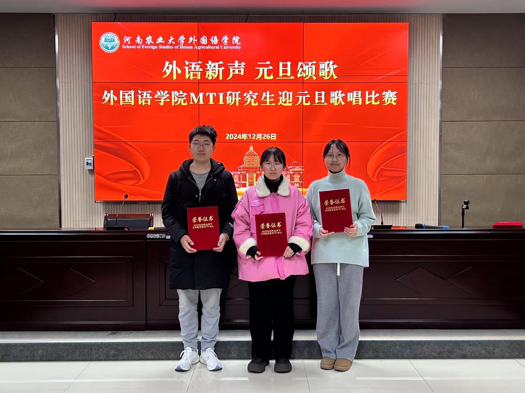 本网讯(审稿:杨鑫 供稿:薛杰)祥龙贺瑞辞旧岁,金蛇欢歌迎新年。值此元旦佳节来临之际,为进一步丰富校园文化生活,营造热烈浓厚的节日氛围,12月26日下午,学院于繁塔楼A324成功举办“外语新声,元旦颂歌”研究生歌唱比赛。研究生辅导员薛杰和学院全体MTI研究生参加本次活动。