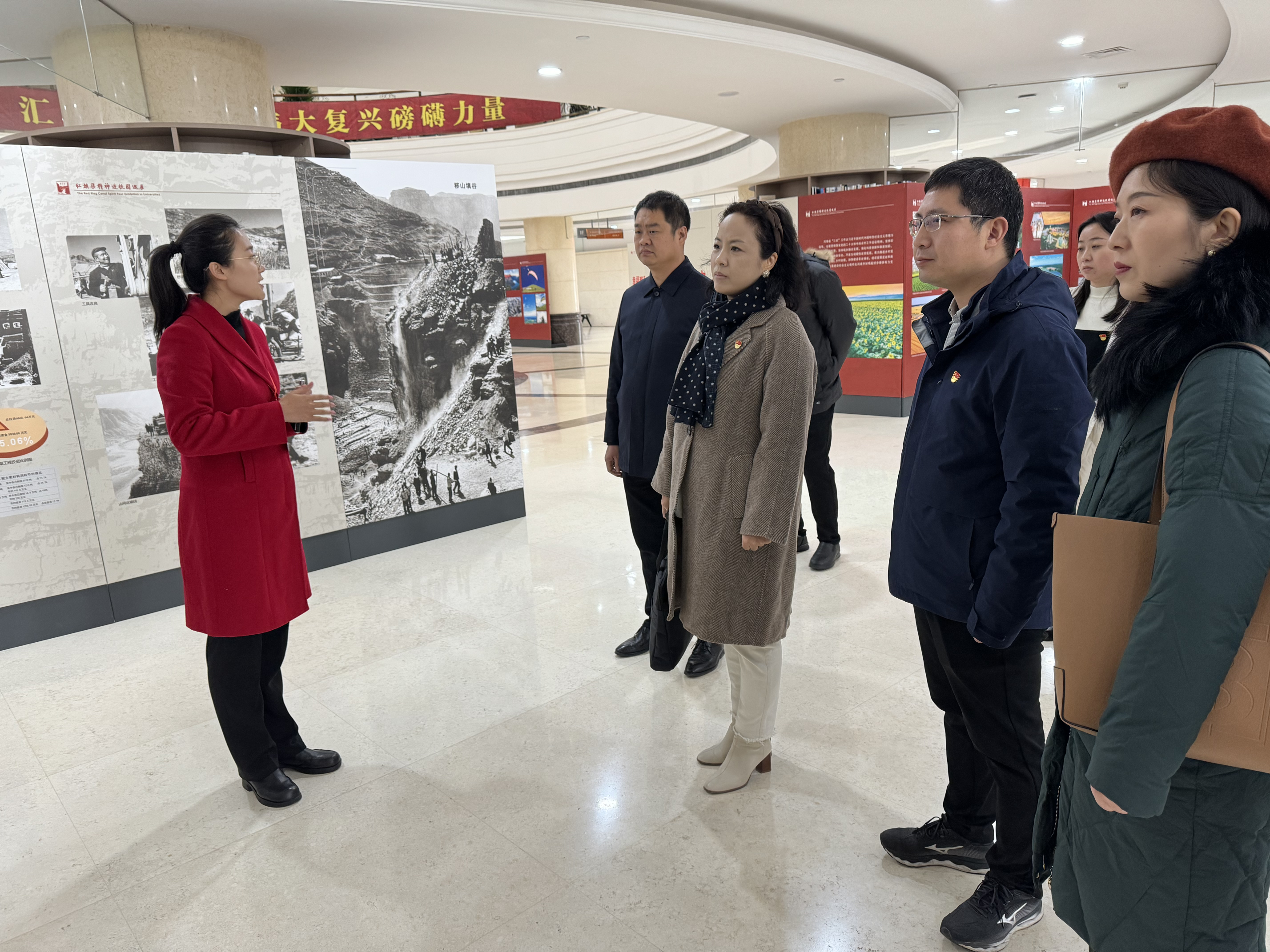 本网讯(审稿:王启佩 供稿:冯超 许菲)为深入学习宣传贯彻习近平新时代中国特色社会主义思想和党的二十大精神,弘扬革命精神,赓续红色血脉。12月1日,肉漫屋 党委书记王燕萍携院领导班子成员、大学生创新创业青年导师工作室教师代表、学生代表参观“红旗渠精神进校园巡展”。