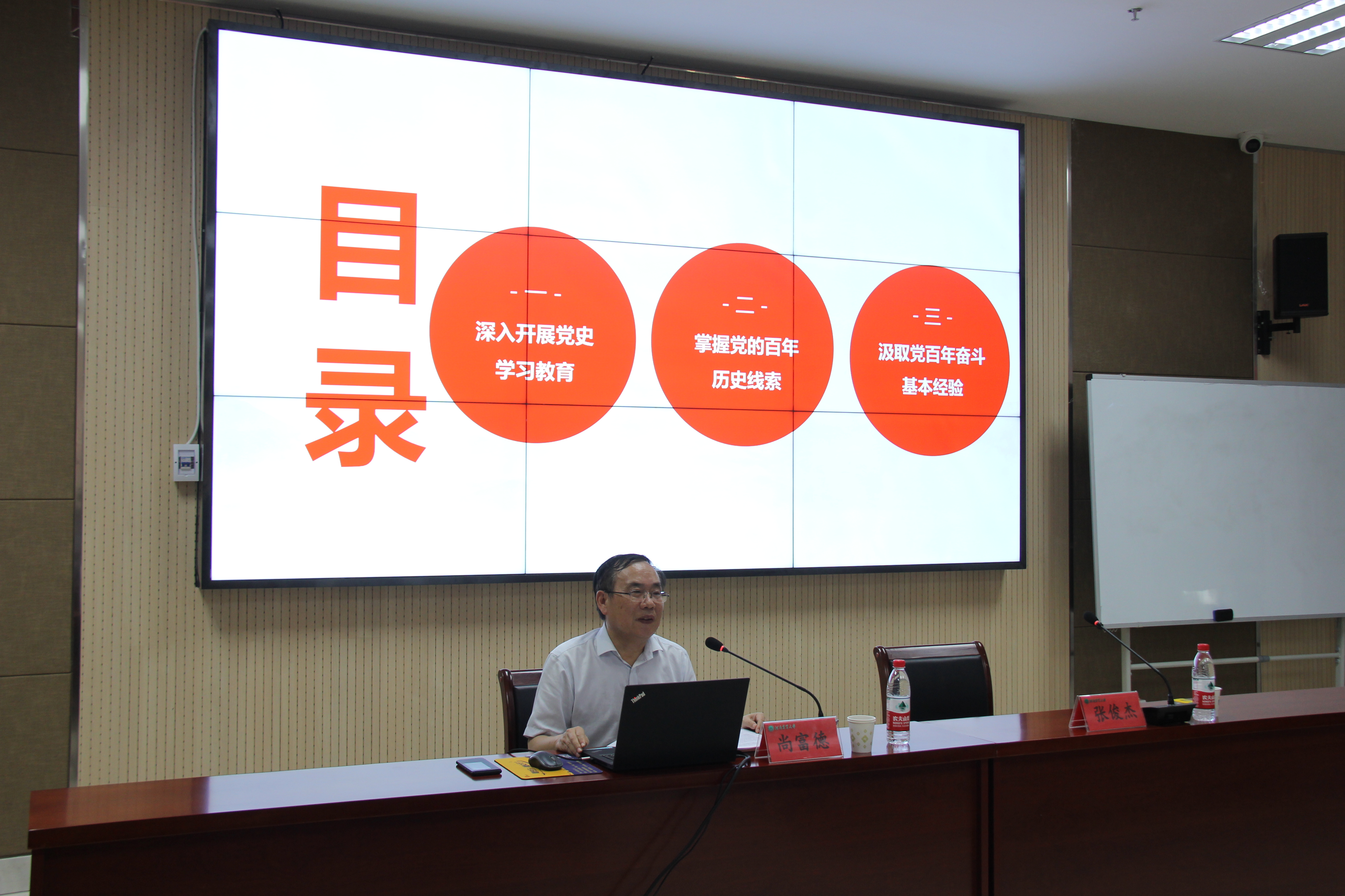 尚富德立足党史学习教育的时代背景和重大意义,结合当前党史学习教育的主要内容及开展情况,围绕“深入开展党史教育、掌握党的百年历史线索、汲取党百年奋斗基本经验”等三个方面进行阐述。他指出,百年党史是一部筚路蓝缕、奠定基业的艰苦奋斗史,是一部与时俱进、守正出新的理论探索史,是一部铸就辉煌、开辟未来的创业创新史。一百年来,中国共产党人依靠科学的理论指导、坚定的理想信念、强大的组织优势、坚实的群众基础以及彻底的自我革命,团结带领全国各族人民披荆斩棘、艰苦奋斗、开拓创新,中华民族实现了从站起来、富起来到强起来的伟大飞跃,创造了一个又一个令世人瞩目的奇迹。。