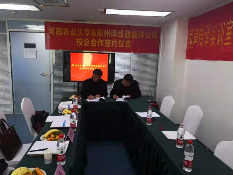 院长张俊杰教授带领学院领导班子及翻译中心(MTI)一行四人赴郑州译线通翻译有限公司考察交流,洽谈校企合作事宜,并举行翻译实习实训基地签约及挂牌仪式。郑州译线通翻译有限公司总经理张富磊、副总经理翟小娟及相关负责人等参加了会谈。
