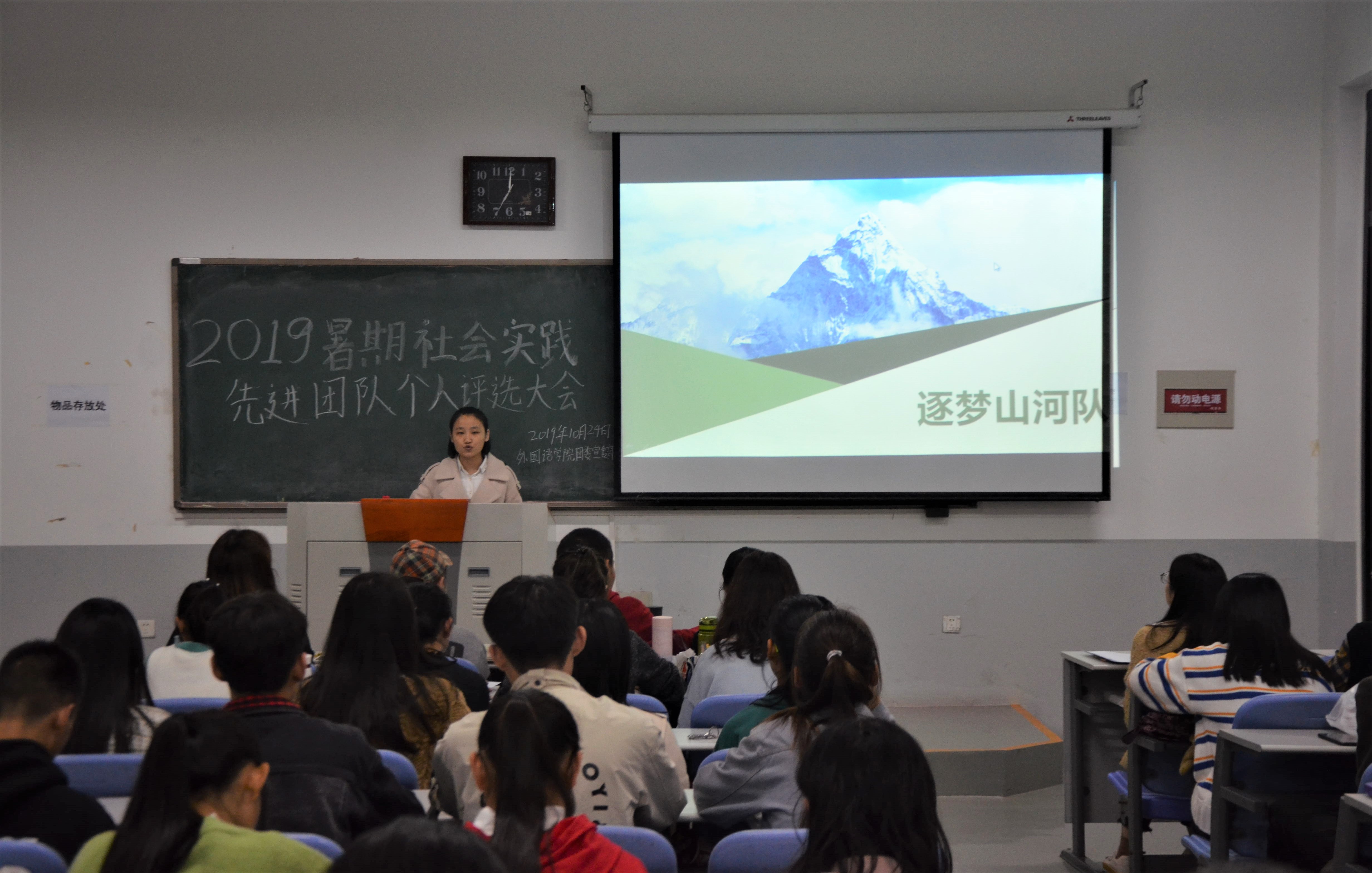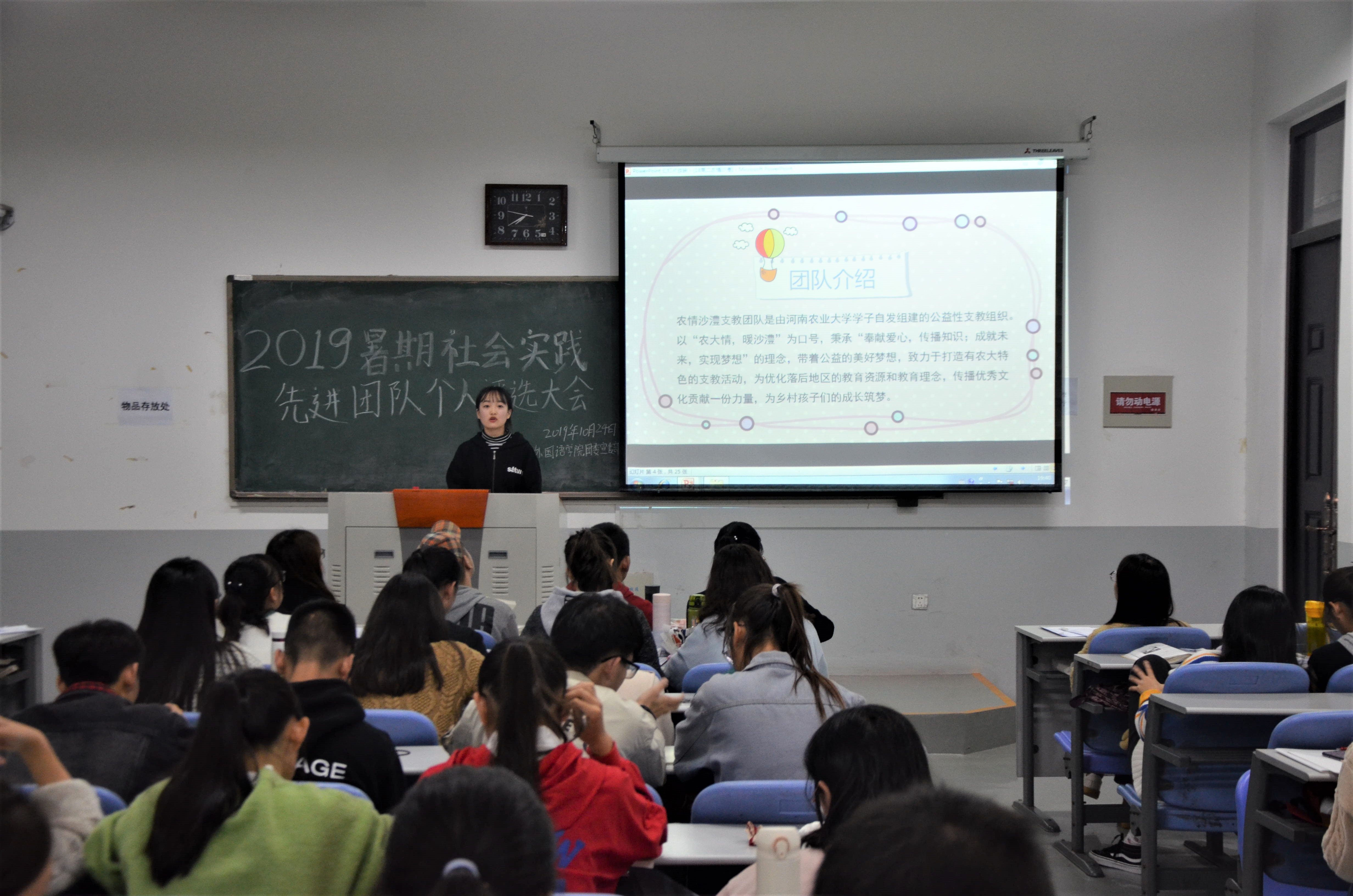 本网讯(审稿:李沛 供稿:梅如意)为弘扬社会实践精神,分享实践收获,充分发挥先进学生的引领示范作用,10月24日晚7点,学院于龙子湖校区繁塔楼C107教室举办了2019年暑期社会实践先进团队及先进个人评选大会。