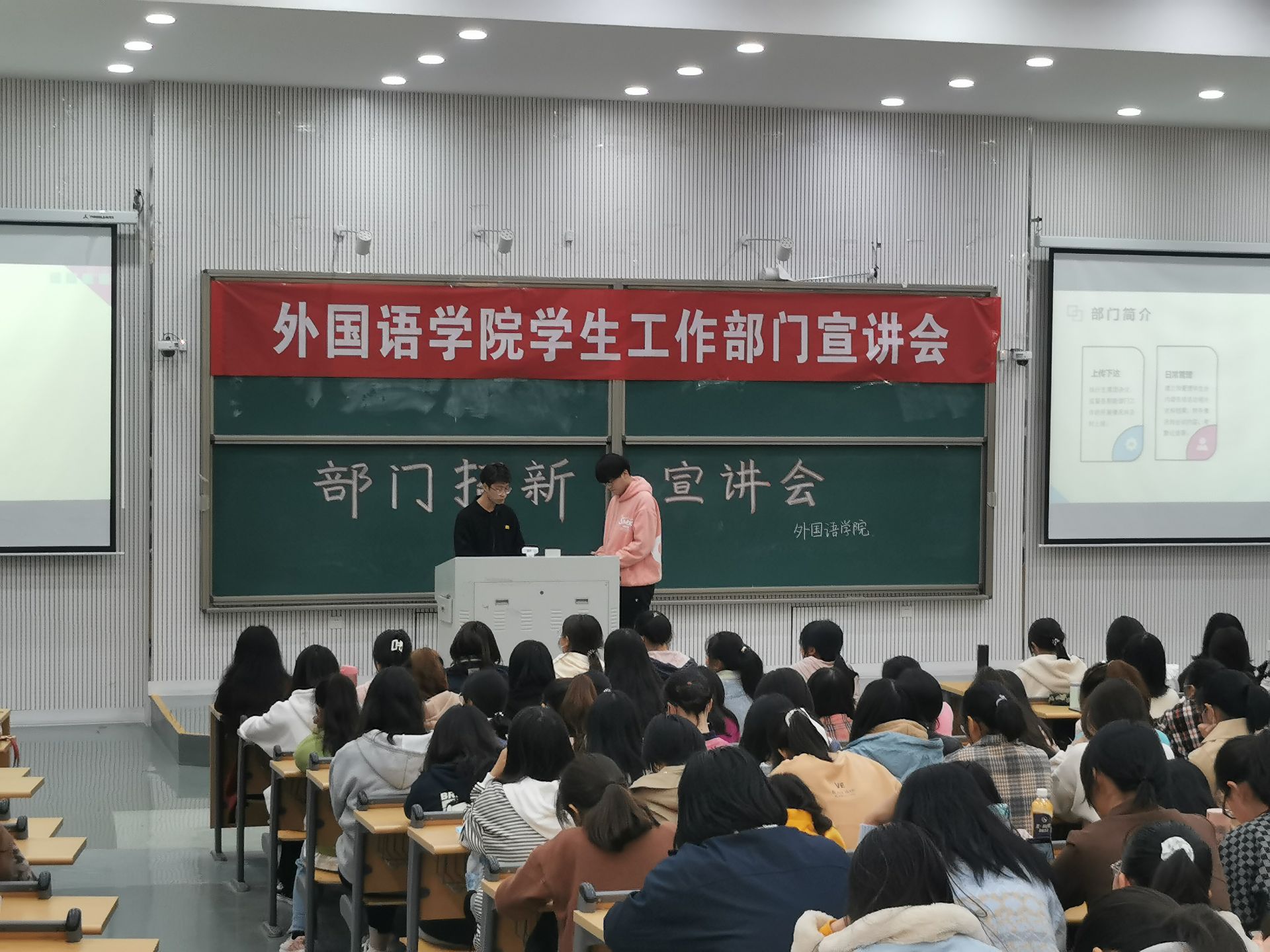 于龙子湖校区繁塔楼DE间大教室八举办了学生工作部门招新宣讲会。各主要学生干部和21级全体新生参加了此次宣讲会。