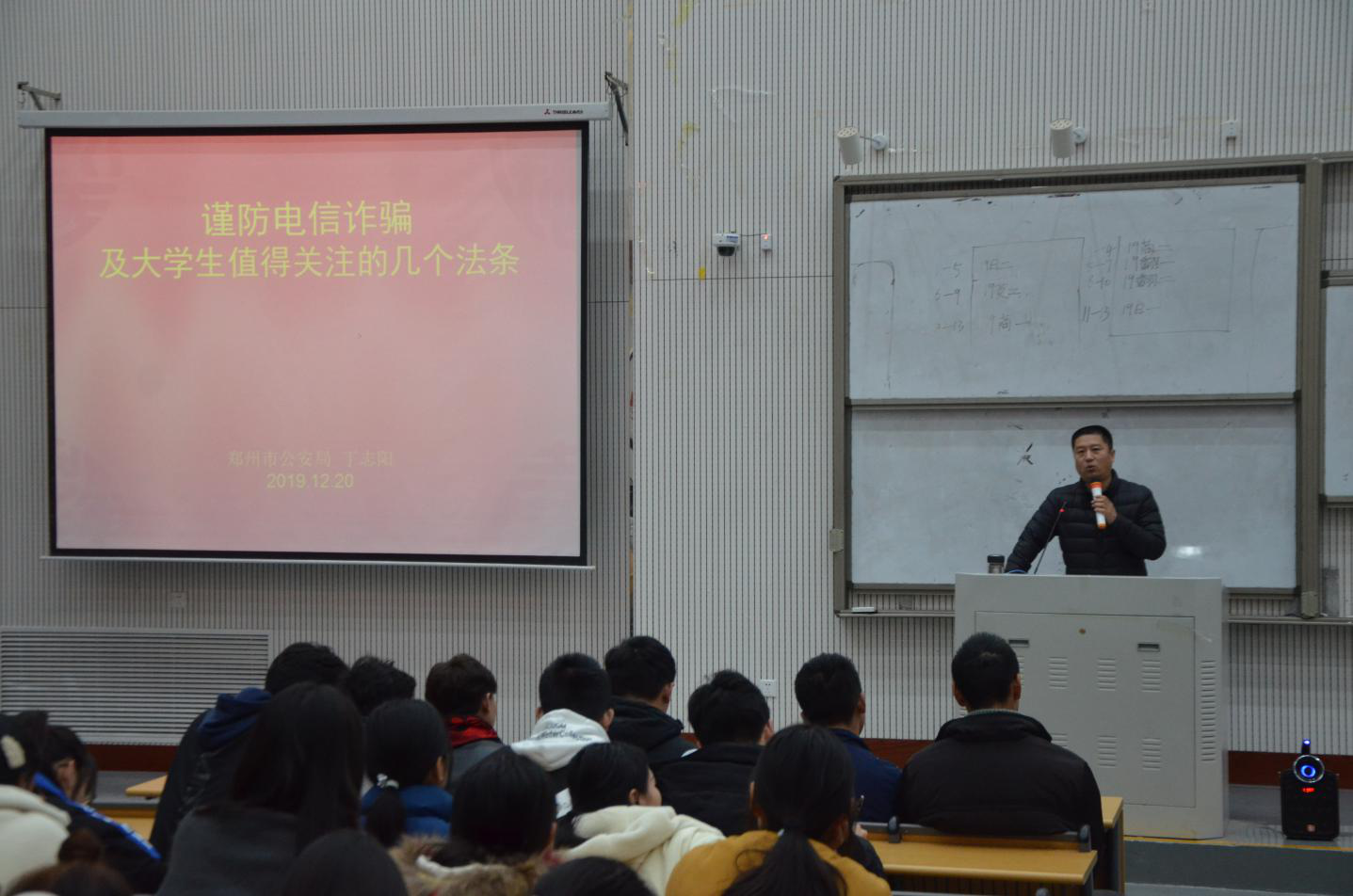诚邀郑州市公安局二级警督丁志阳警官于龙子湖校区繁塔楼大教室5举办防范电信诈骗知识讲座。学院团委书记李沛、辅导员牛烁携学院主要学生干部、17级和18级各班心理委员、19级全体学生聆听了本次讲座。本次讲座由李沛主持。