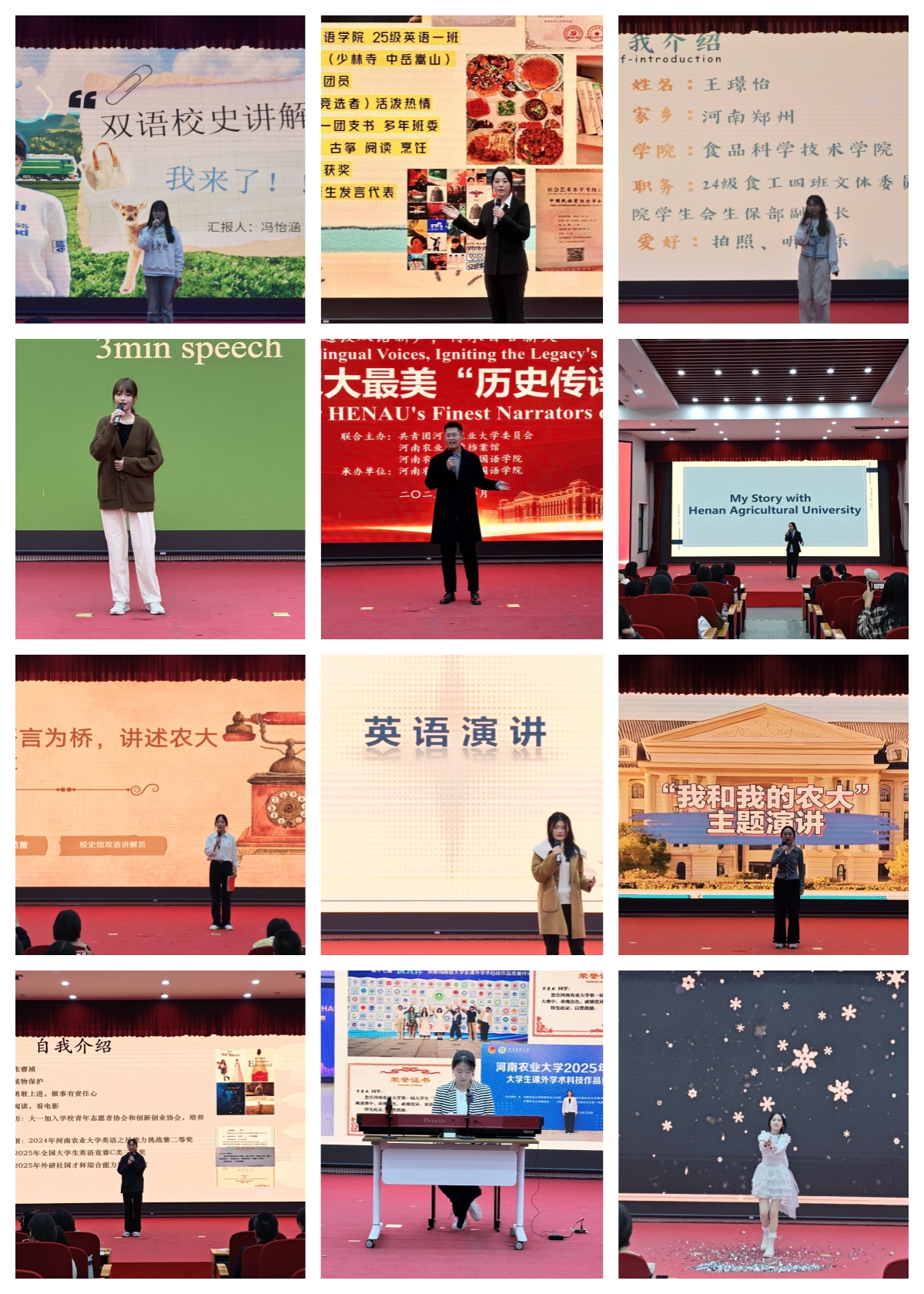 本次赛事共吸引来自全校的100余名选手报名参赛,经过视频预赛、现场初赛等多轮选拔,来自6个学院的12名选手入围决赛。决赛共分为中文个性化自我介绍、“我和我的农大”英文主题演讲、才艺展示三个环节。选手们结合PPT、短视频,生动展示自身特色;中英文流畅表达与饱满的情感打动在场观众;钢琴弹唱、舞蹈、配音秀、脱口秀等形式轮番上演,精彩表现让观众席传来阵阵喝彩。