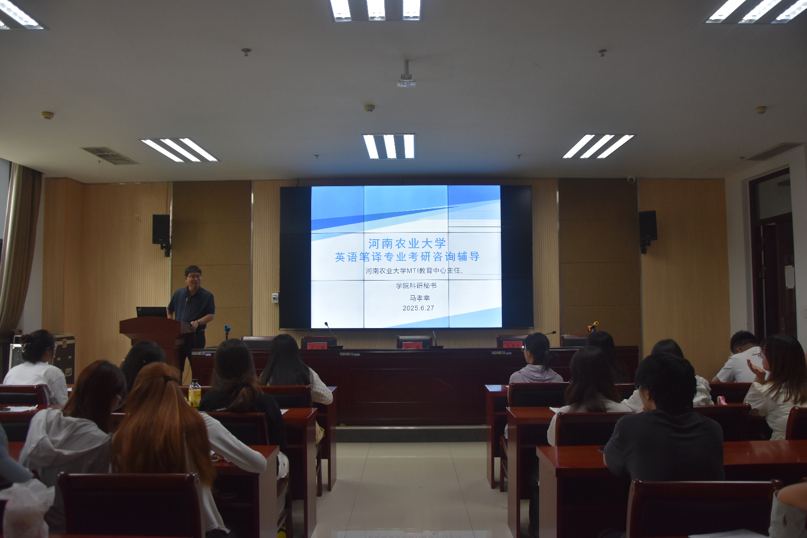 本网讯(审稿:杨鑫 供稿:武宗励 张梦晗)为进一步为学生提供全面的考研政策解读和备考指导,做好研究生招生宣传工作。6月27日,肉漫屋 繁塔楼A324开展考研指导暨研究生招考信息宣讲会。宣讲会由院科研秘书、MTI教育中心主任马孝幸主讲,22级全体留校学生参加会议。