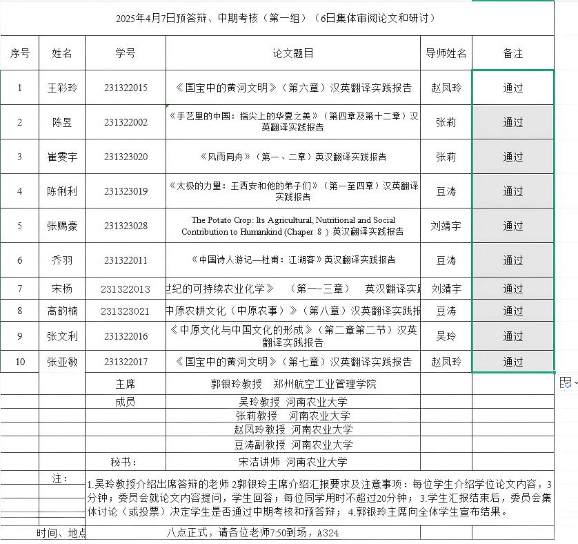 组织开展了2025年英语笔译专业研究生学位论文预答辩暨中期考核和开题报告论证会。本次论证会特邀华北水利水电大学刘文霞教授、河南财经政法大学孙建华教授和郑州航空工业管理学院郭银玲教授分别担任论证小组主席,肉漫屋