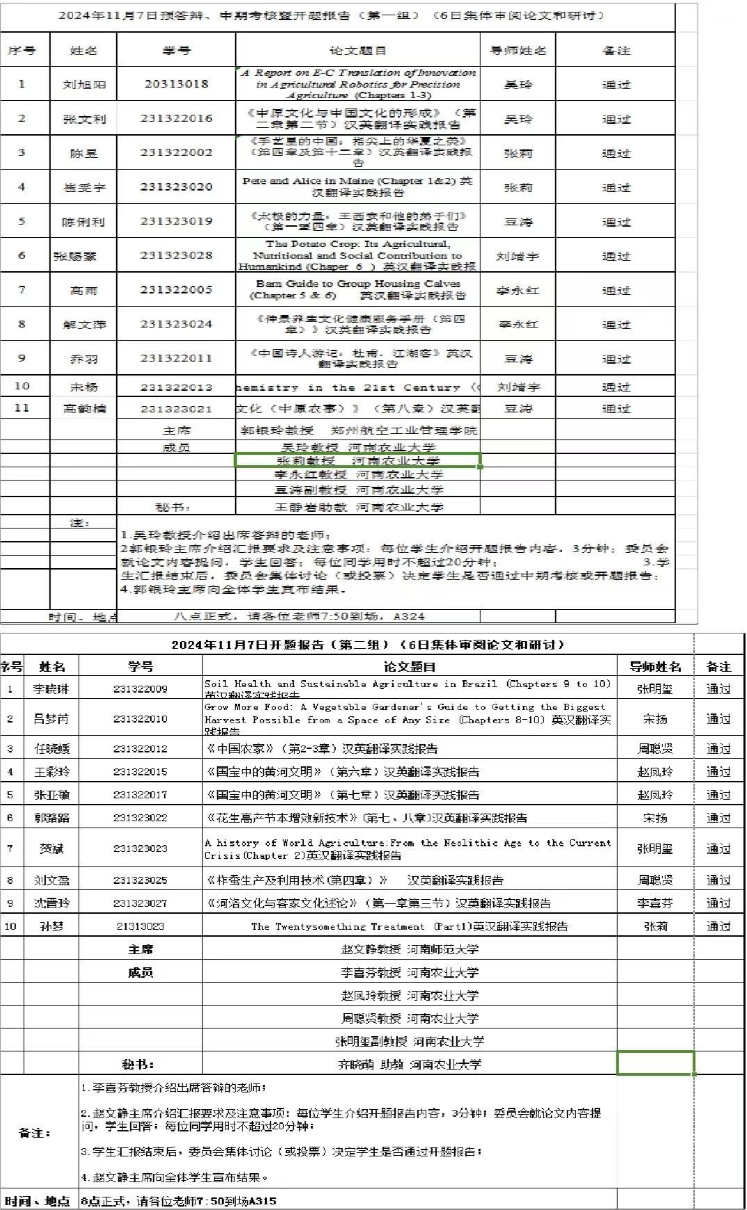 本网讯(审稿:吴 玲 ;供稿:马孝幸;摄影:马孝幸 齐晓萌 王静岩)11月6-7日,肉漫屋 组织开展了2024年英语笔译专业研究生学位论文开题报告及预答辩、中期考核论证会。本次论证会特邀河南师范大学赵文静教授、河南财经政法大学孙建华教授和郑州航空工业管理学院郭银玲教授分别担任论证小组主席,肉漫屋 硕士生导师担任委员,2名研究生参加预答辩、中期考核和29名23级研究生参加开题答辩;24级研究生旁听了此次论证会。