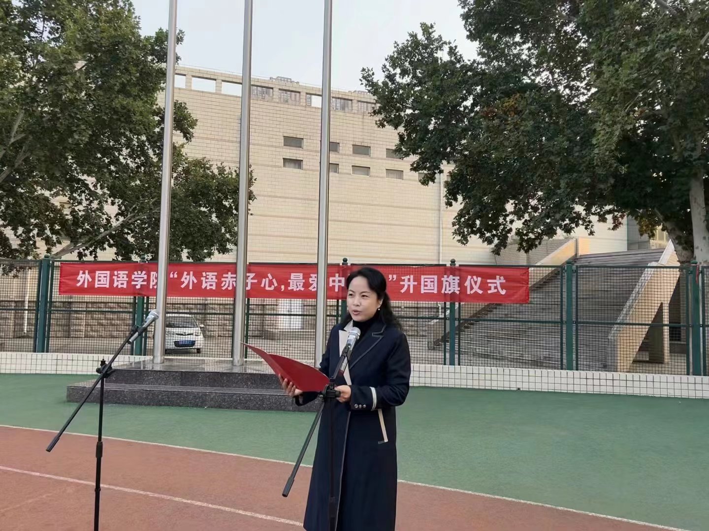 王燕萍发表了国旗下的讲话,她表示,“中国红”是中国革命的颜色、奋斗精神的颜色、人民信仰的颜色、绚丽青春的颜色。在农大121年的办学历程中,广大农大学子以良好的精神风貌和过人的意志品质,做到了“丹心与日月同在,赤诚共红旗飞扬”。她强调,作为新时代的农大外语人,要牢记总书记的嘱托,紧紧围绕“七个着力”,坚定文化自信,坚持守正创新,不断用外语讲好中国故事,传播中国声音,立志做有理想、敢担当、能吃苦、肯奋斗的新时代好青年。