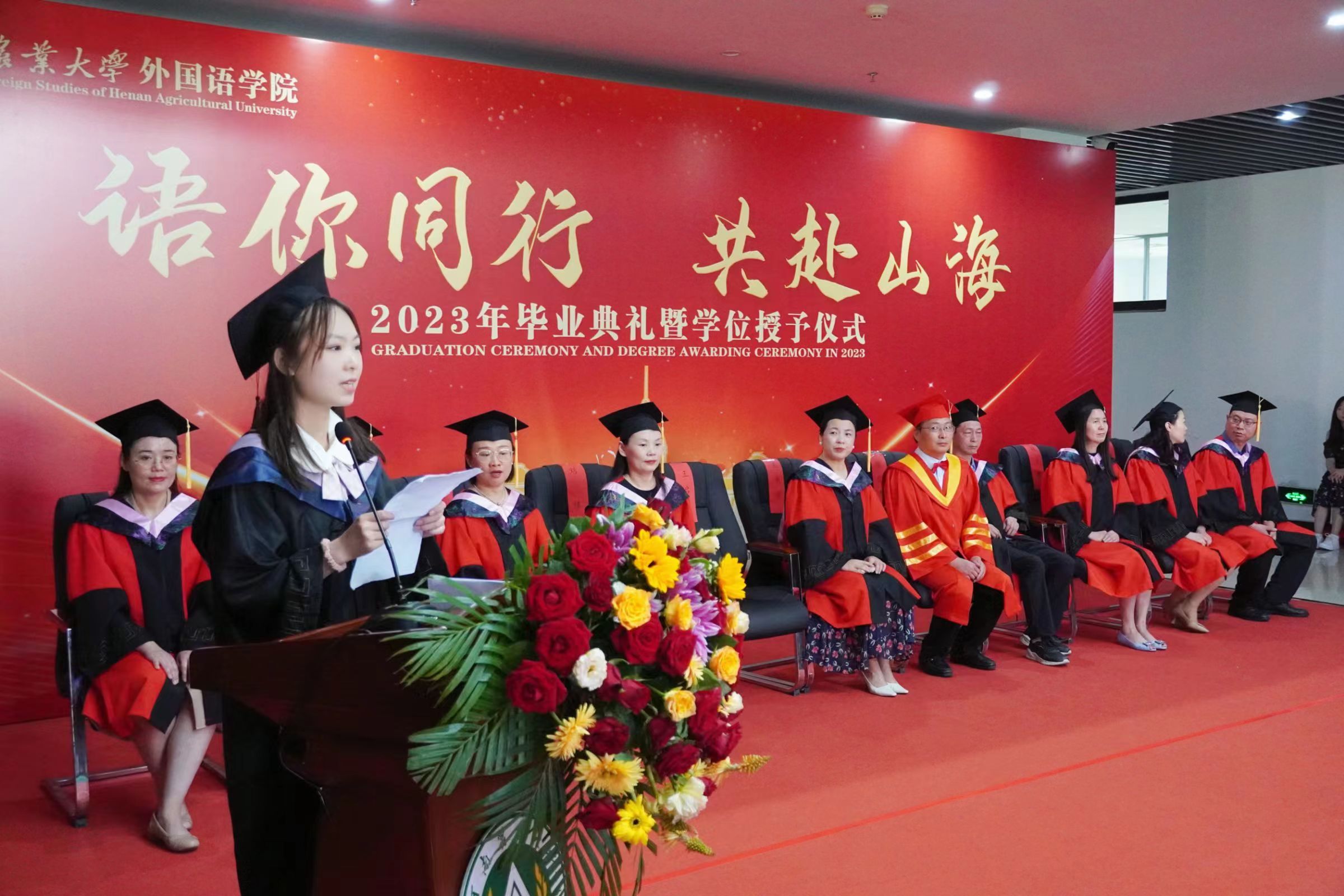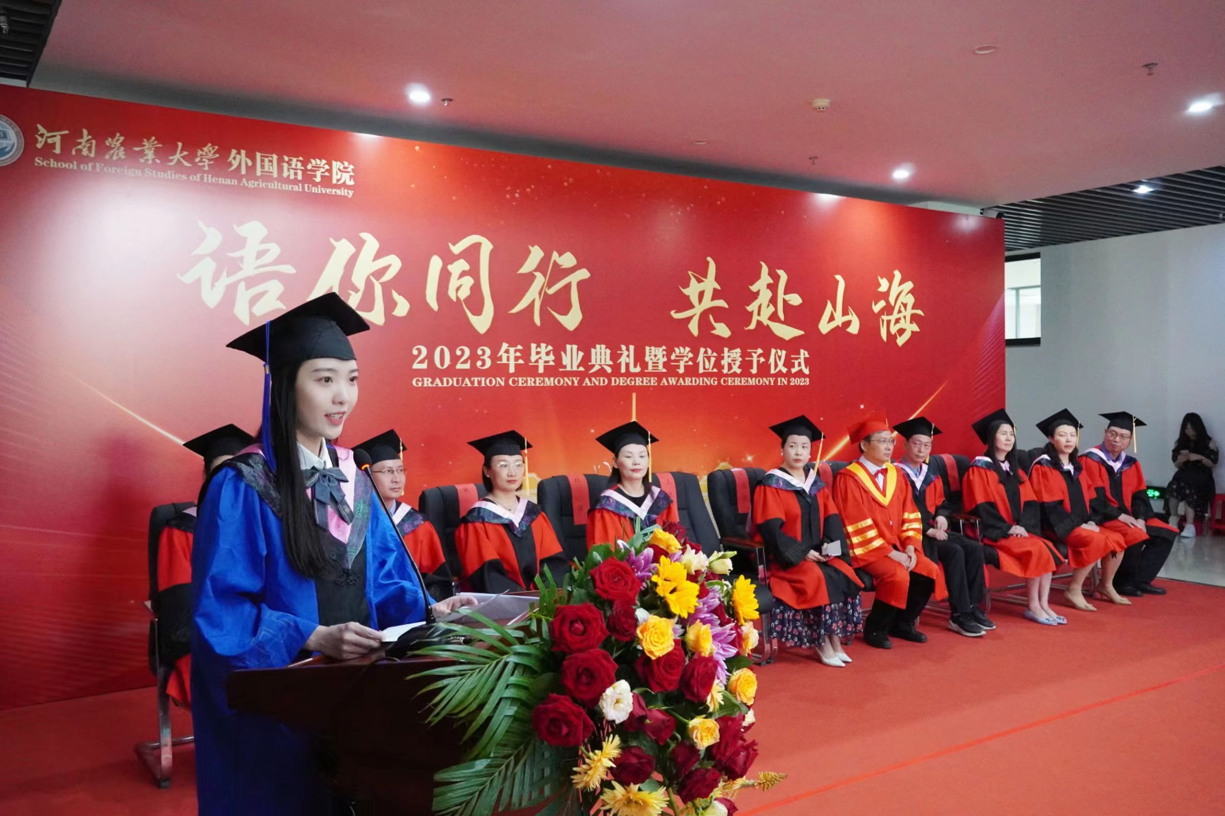 张俊杰总结了学院四年来的发展成绩,回顾了同学们的成长经历,并对2023届全体毕业生提出了殷切希望:一是希望大家长存明辨是非的理性精神,在现实世界里学会为自己的选择负责;二是希望大家永葆热爱祖国的赤子之心。他指出,爱国之行、报国之志是一个人的立身之本、成才之基,也是农大人一脉相承的信念底色,为国家的富强和民族的复兴做出贡献是每个中华儿女义不容辞的责任;三是希望大家胸怀包容开放的思想,为构建人类命运共同体贡献我们外语学者的力量。最后,他寄语毕业生们谨记明德笃志、励学尚行的院训,发扬农大人的质朴、勤奋和实干精神,恪守诚信、坚持学习,在服务社会中建功立业。