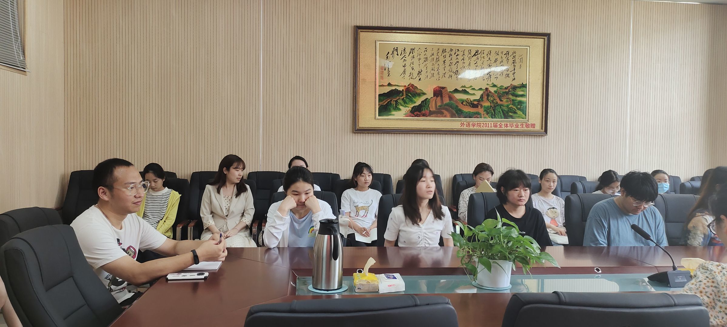 于龙子湖校区繁塔楼A320会议室召开了毕业生座谈会。党委副书记王启佩、团委副书记陈桃、冯超和辅导员穆君怡携17级班长支书和主要学生干部参会。