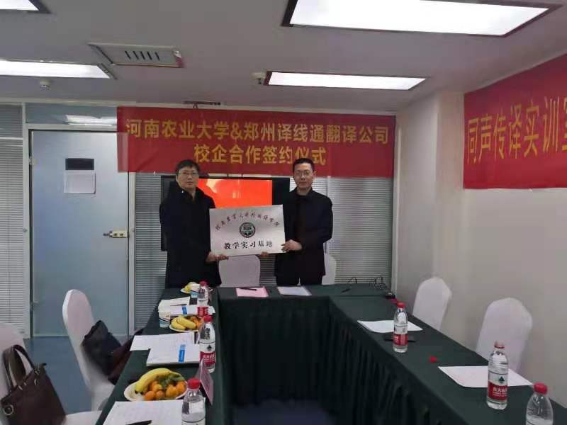 院长张俊杰教授带领学院领导班子及翻译中心(MTI)一行四人赴郑州译线通翻译有限公司考察交流,洽谈校企合作事宜,并举行翻译实习实训基地签约及挂牌仪式。郑州译线通翻译有限公司总经理张富磊、副总经理翟小娟及相关负责人等参加了会谈。