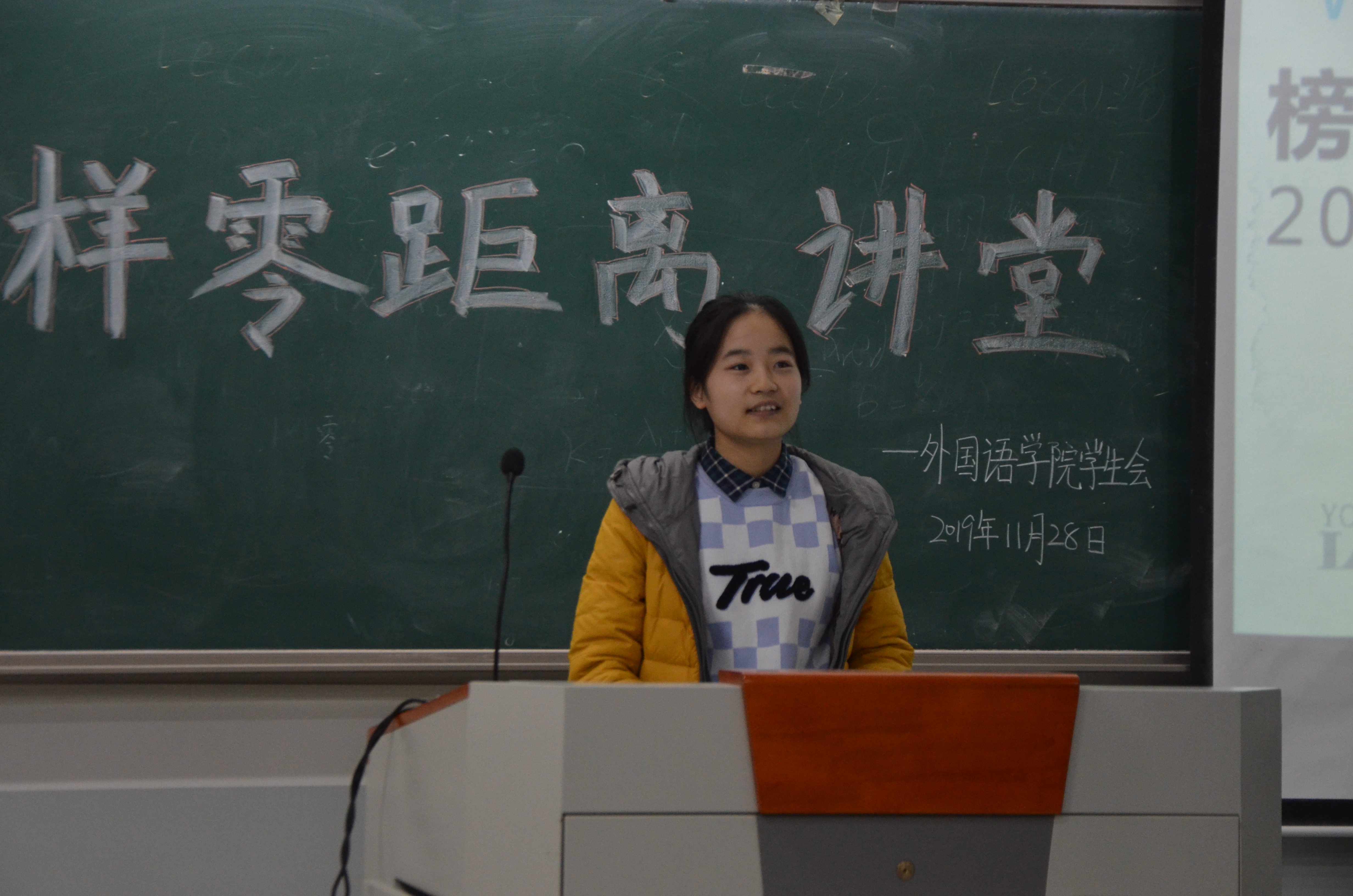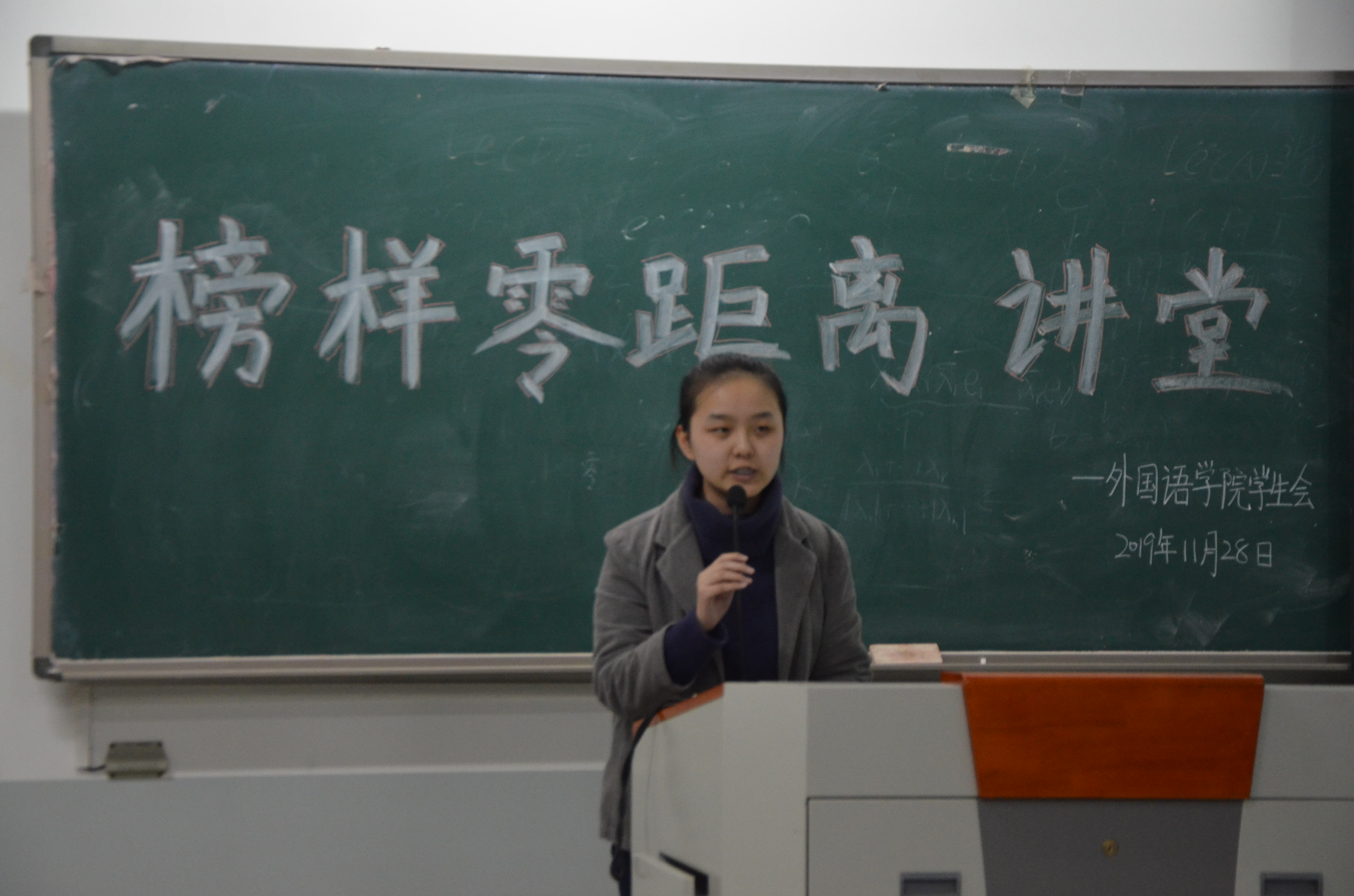 学子学习的积极性和主动性,11月28日晚上七点,学院于龙子湖校区繁塔楼C306教室举办第十七期榜样零距离讲堂。16级英语一班曹锦秀、16级商务英语二班王诗雨、17级英语一班周瑞文及17级商务英语三班李歌畅应邀担任主讲人。