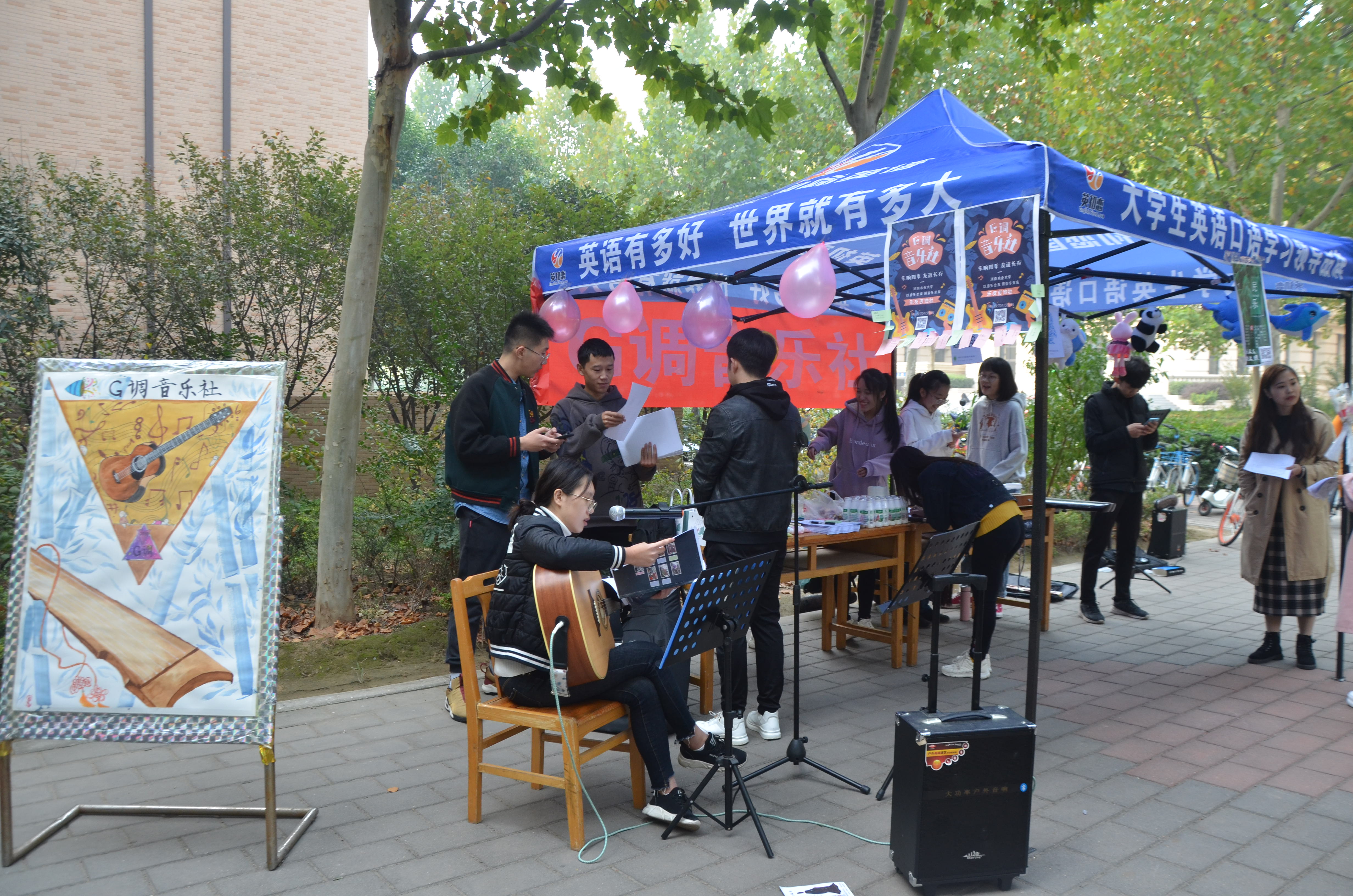 的四大社团——英译协会、横溢方舟社、微光公益协会、G调音乐社在社团招新中尽显风采。