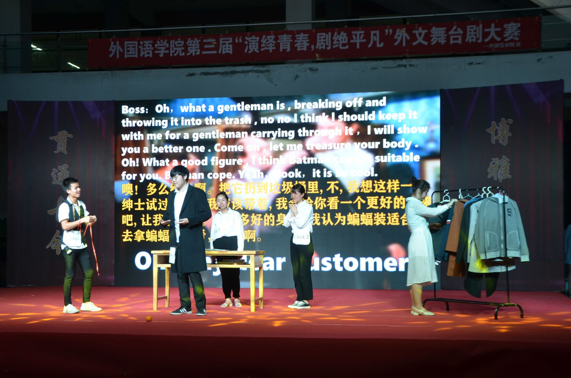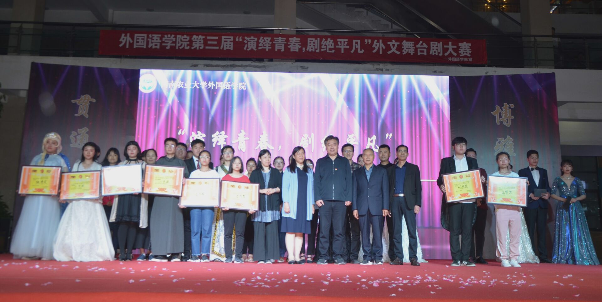 于2019年5月10日晚上六点半在龙子湖校区一餐厅广场举办外文舞台剧大赛决赛。校党委副书记、工会主席李成吾、院关工委常务副主任吴海峰、校团委书记马菲等出席比赛,张莉、杨华、刘靖宇、刘佳、聂宝玉担任评委。学院领导班子携师生代表观看了比赛。