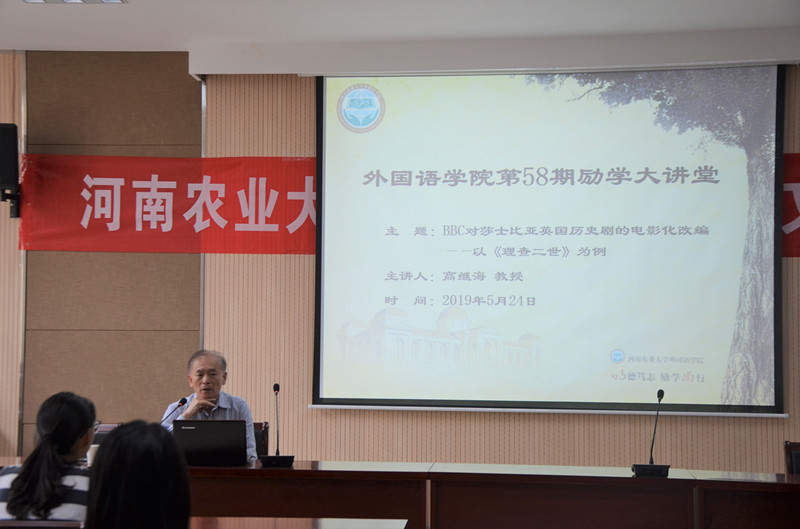 有幸邀请到河南大学高继海教授做了以“BBC对莎士比亚英国历史剧的电影化改编——以《查理二世》为例”为题的专题报告。学院教师代表张莉、聂宝玉携部分学生代表参与此次讲堂。本次讲座由聂宝玉主持。