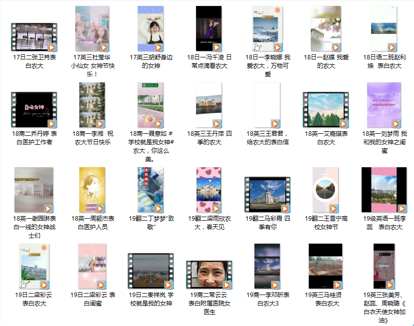 在国家疫情防控工作指导下,学院创新活动形式、精心策划组织,学院学生兴致勃勃,踊跃参与,带来一场别开生面的文化盛宴。本次活动以“爱荣爱校,学会感恩”为主题,以网络作品为载体,学生热情地向心中的“女神”表白:不管是亲爱的家人、老师,亲密的同学、闺蜜,还是疫情中默默付出的社会工作者,都是同学们魅力无限,可敬可爱的女神。同学们积极创新、各显神通,各类作品风格迥异,让人大开眼界,赞叹不已。无论是一抹抹俏丽身影组成的视频,还是一句句真情流露汇成的文章,都体现了同学们对世界的诚挚感恩,对美好生活的热爱和追求。