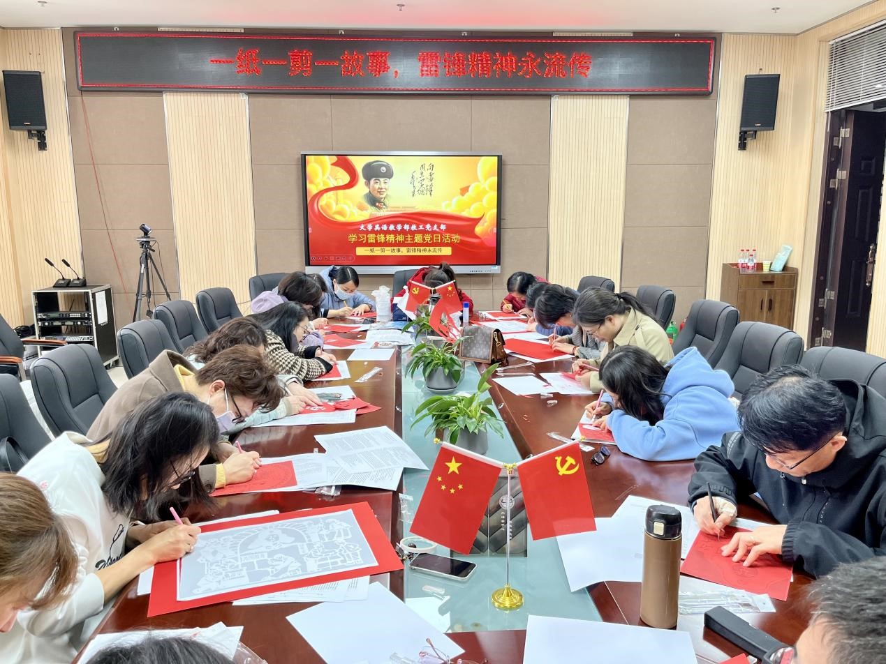 大学英语教学部教工党支部组织党员开展“一纸一剪一故事,雷锋精神永流传”为主题的主题党日活动,通过剪纸艺术演绎雷锋精神,鼓励党员教师积极发挥自律性和示范性,争做新时代的文明传播者,用实际行动践行社会主义核心价值观。