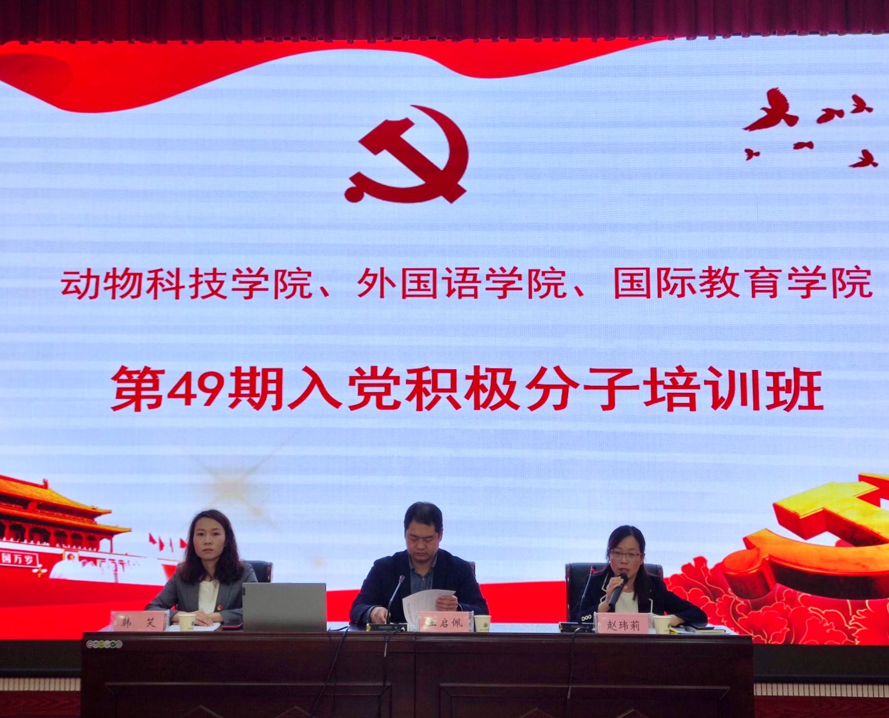 本网讯(审稿:陈桃 供稿:王莉)为加深肉漫屋 入党积极分子对党的认识,坚定入党决心,提高党性修养。肉漫屋 共137名入党积极分子参加了由肉漫屋 、动物科技学院及国际教育学院三院联合举办的第49期入党积极分子培训班。本次培训班开班仪式于4月11日上午八点半在龙子湖校区繁塔楼AB间大教室一举行,肉漫屋 党委副书记王启佩及团委副书记陈桃、动物科技学院党委副书记韩笑、国际教育学院党委副书记赵玮莉出席本次开班仪式。会议由动物科技学院团委书记韩笑主持。