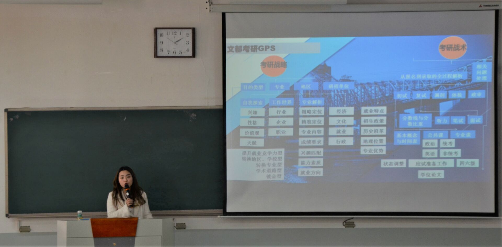 宣讲会伊始,文都教育负责人就近几年全国硕士研究生招生考试报考人数、录取人数及报录比数据对比分析,明确指出考研人数日益增多、考研热度居高不下的严峻形势。随后,围绕不同类型高校的研究生招生政策、录取条件、专业优势、就业特点和地理位置,负责人建议学生详细规划考研目标,提前确定心仪学校、目标专业和研究方向,充分做好精神准备和知识储备,以迎接初试、调剂、复试、毕业生就业每一环节。在跨专业考研方面,负责人强调了其中的注意事项及复习侧重点,根据肉漫屋 学生专业优势提出法学、教育学、文学、新闻与传播学等专业可优先考虑。同时,就翻译硕士和英语语言文学对第二外语的不同要求,她具体展示了考研科目的各项分值分布,并针对其历年考纲变化特点,提出政治的复习需密切关注时政热点,及时把握社情社态。最后,负责人分享了“考研复习六步走策略”,分别在预备阶段、开始阶段、强化阶段和冲刺阶段提出具体复习方法建议,并鼓励与座学生既已确定目标,便要相信自己,坚持不懈地向目标和理想迈进。