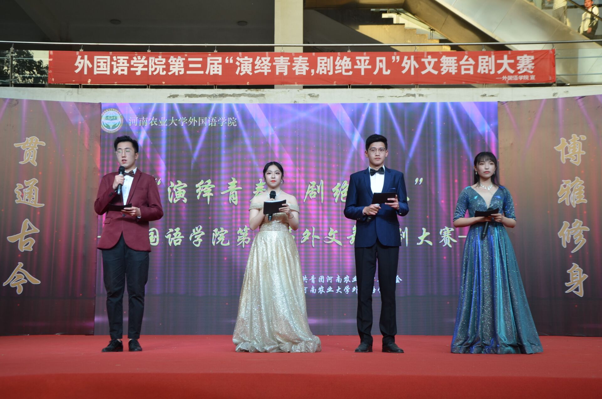 于2019年5月10日晚上六点半在龙子湖校区一餐厅广场举办外文舞台剧大赛决赛。校党委副书记、工会主席李成吾、院关工委常务副主任吴海峰、校团委书记马菲等出席比赛,张莉、杨华、刘靖宇、刘佳、聂宝玉担任评委。学院领导班子携师生代表观看了比赛。