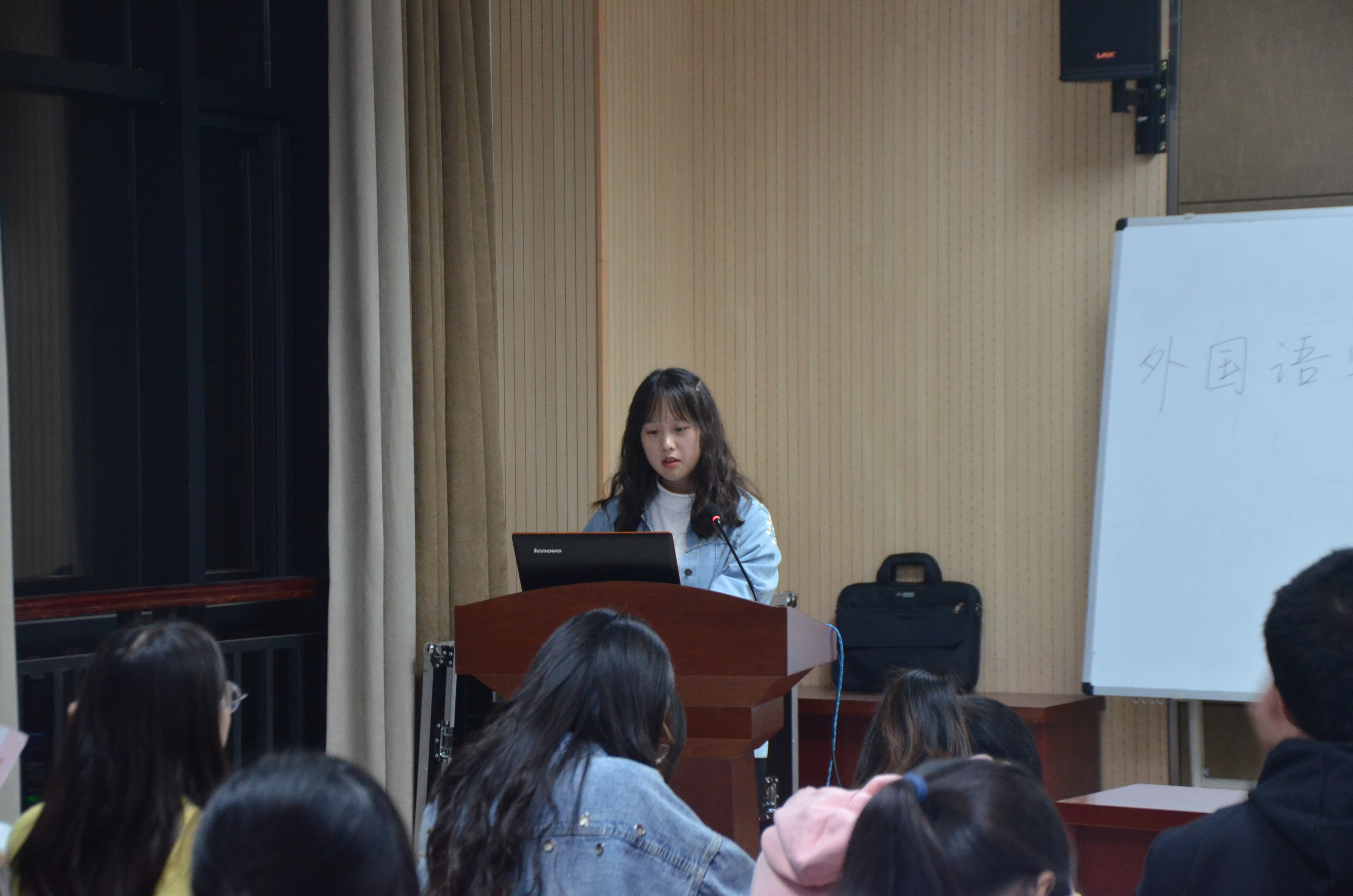在主持人宣布了此次微团课大赛的评选细则和评分标准之后,评选大赛正式拉开序幕。期间,参赛者主要围绕庆祝中华人民共和国成立七十周年、学习党的基本理论知识、学习团的基本知识以及传承中华优秀传统文化等方面,结合精美的PPT进行现场演说。其中,赵浩男以共青团内基础知识为主题讲解了共青团的光荣传统以及团旗、团徽、团歌、团员证的相关知识,大大增加了学生们对于共青团的深层次了解。张丹丹讲到河南“三大精神”即焦裕禄精神、红旗渠精神、愚公移山精神在新时代仍熠熠生辉。她呼吁广大青年传承和发扬三大精神,从我做起,身体力行,使其在新时代继续焕发出璀璨的光芒。刘丽以青年为主体,做了“五四献青春、青春圆吾梦”的演讲,她表示爱国主义是五四精神的核心,站在历史的新起点上,传承五四精神的最好方法就是赋予其新的时代内涵,作为当代青年,要以青春之力,担复兴之责,与时代同步,在奔跑中前行。
