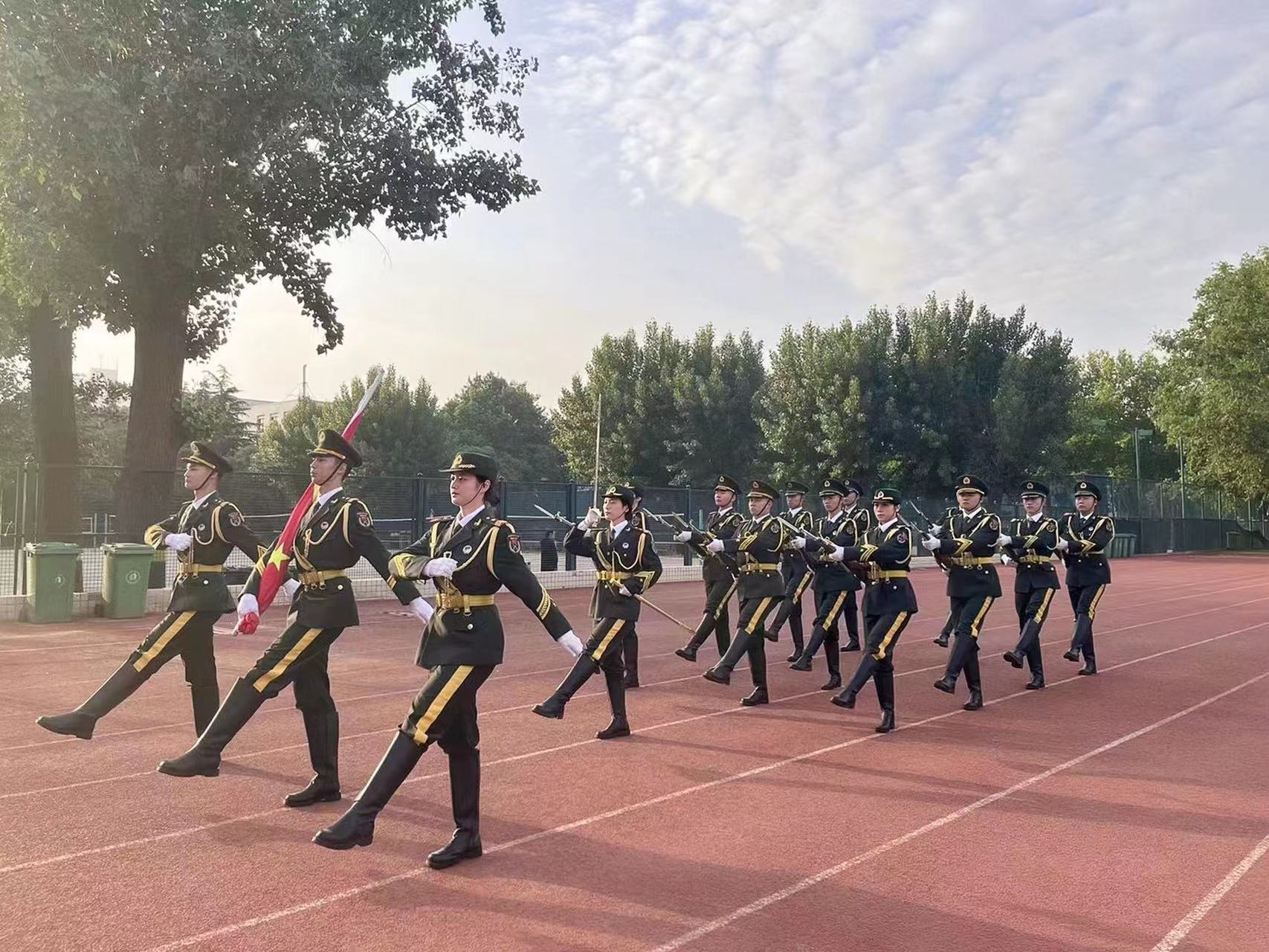 校国旗护卫队昂首挺胸,迈着整齐有力的步伐,护卫国旗入场。伴随着慷慨激昂的《义勇军进行曲》,全体师生肃立,齐唱国歌,行注目礼,鲜艳的五星红旗迎着朝阳,冉冉升起,飘扬在校园上空。