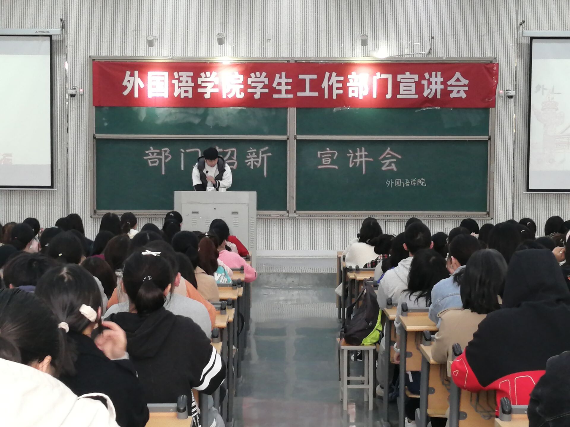 于龙子湖校区繁塔楼DE间大教室八举办了学生工作部门招新宣讲会。各主要学生干部和21级全体新生参加了此次宣讲会。