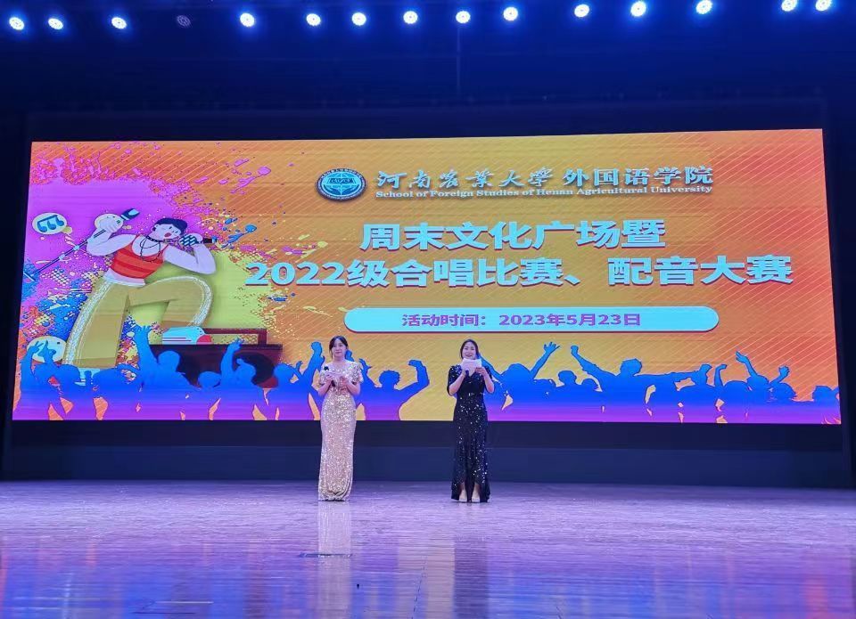 于5月23日晚7点在文化路校区千人大礼堂举办周末文化广场暨2022级合唱比赛、配音大赛。外教Brad一家作为特邀嘉宾莅临现场,团委书记冯超、辅导员武宗励、周远航及学生会负责人担任评委,22级全体同学参与了此次活动。
